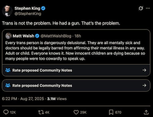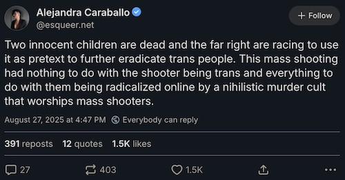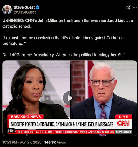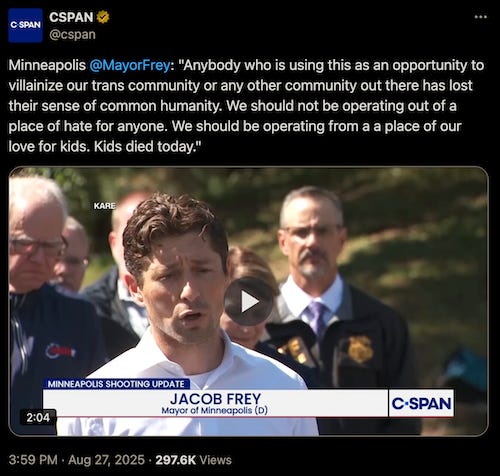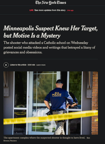 Yesterday in Minnesota, a man who claimed to be a woman shot up a Catholic church full of children. He wasn’t a “trans woman,” let alone a woman. He was a man. A very crazy man.