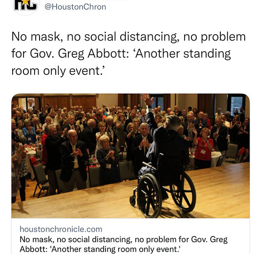 What does one thing have to do with the other? Abbott hasn’t banned masks. If you want your kid to wear a mask, he isn’t stopping you. And he isn’t stopping anybody from getting vaccinated. If anything, he’s a test case for why you should get vaccinated. He’s a vaccine success story.