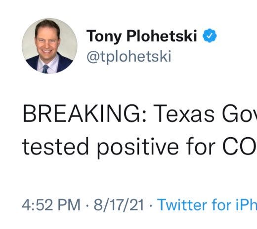 The bad news is that Texas Governor Greg Abbott has COVID-19. The good news is that he’s vaccinated and feels fine.